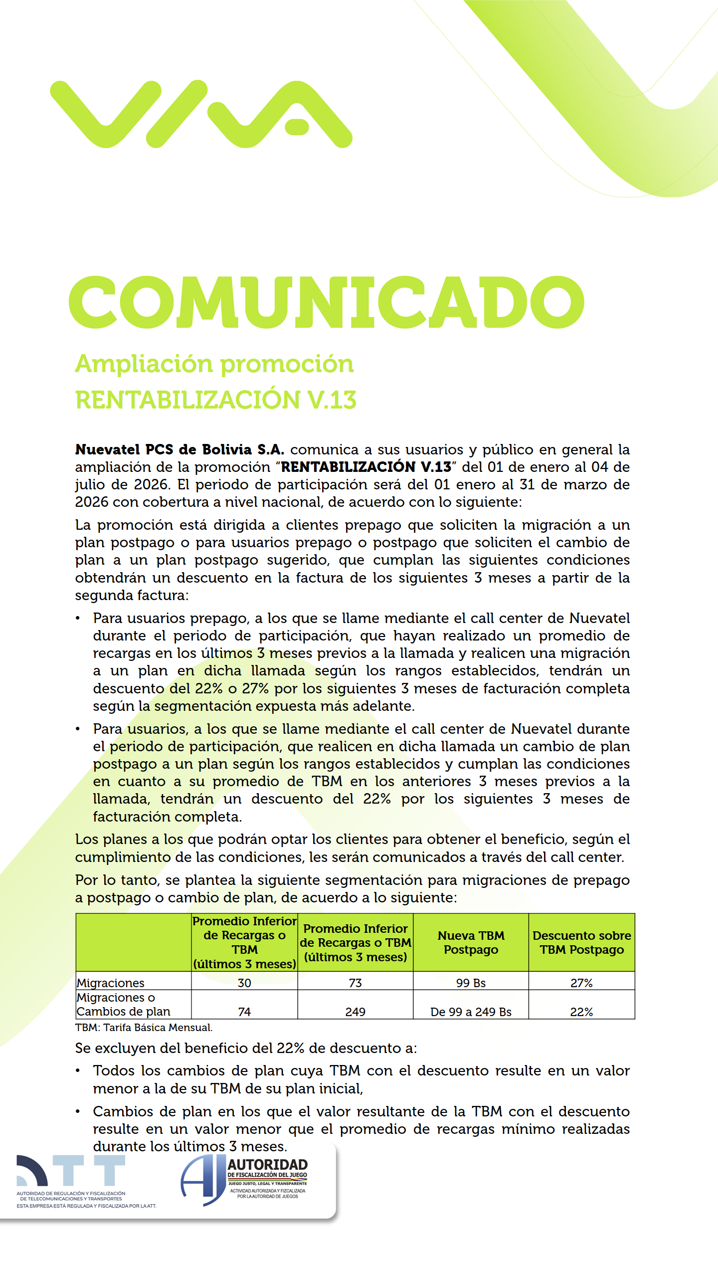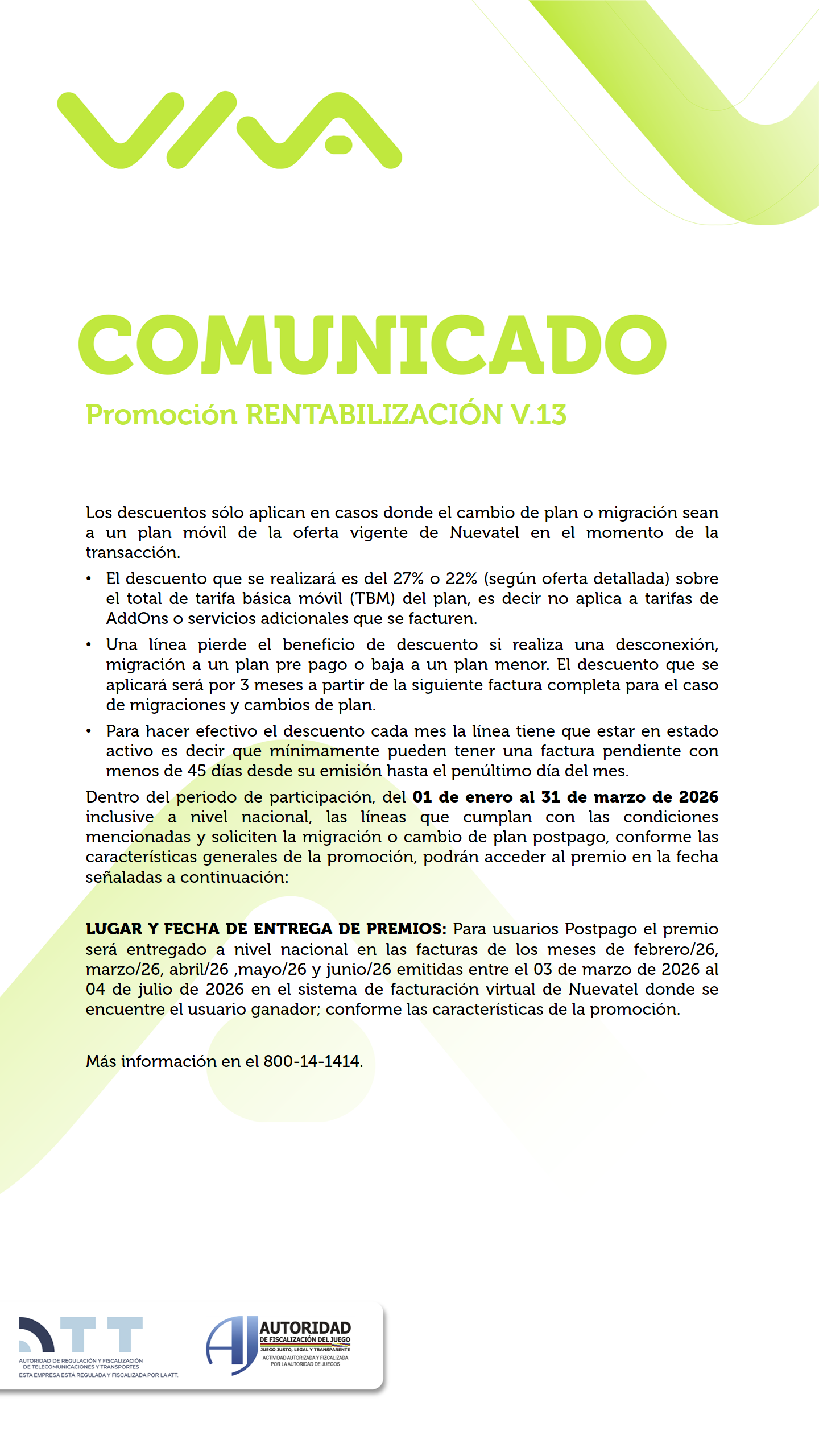 VIVA Comunicados promocionales Fecha de publicación: 26-02-2026 Ampliacion Rentabilizacion V.13 1/2 VER COMUNICADO Fecha de publicación: 26-02-2026 Ampliacion Rentabilizacion V.13 2/2 VER COMUNICADO Fecha de publicación: 15-02-2026 Cashback - pago en cuotas de equipo 1-2 VER COMUNICADO Fecha de publicación: 15-02-2026 Cashback - pago en cuotas de equipo 2-2 VER COMUNICADO Fecha de publicación: 30-01-2026 Ampliación Rentabilizacion V.13 1-2 VER COMUNICADO 1 23Siguiente