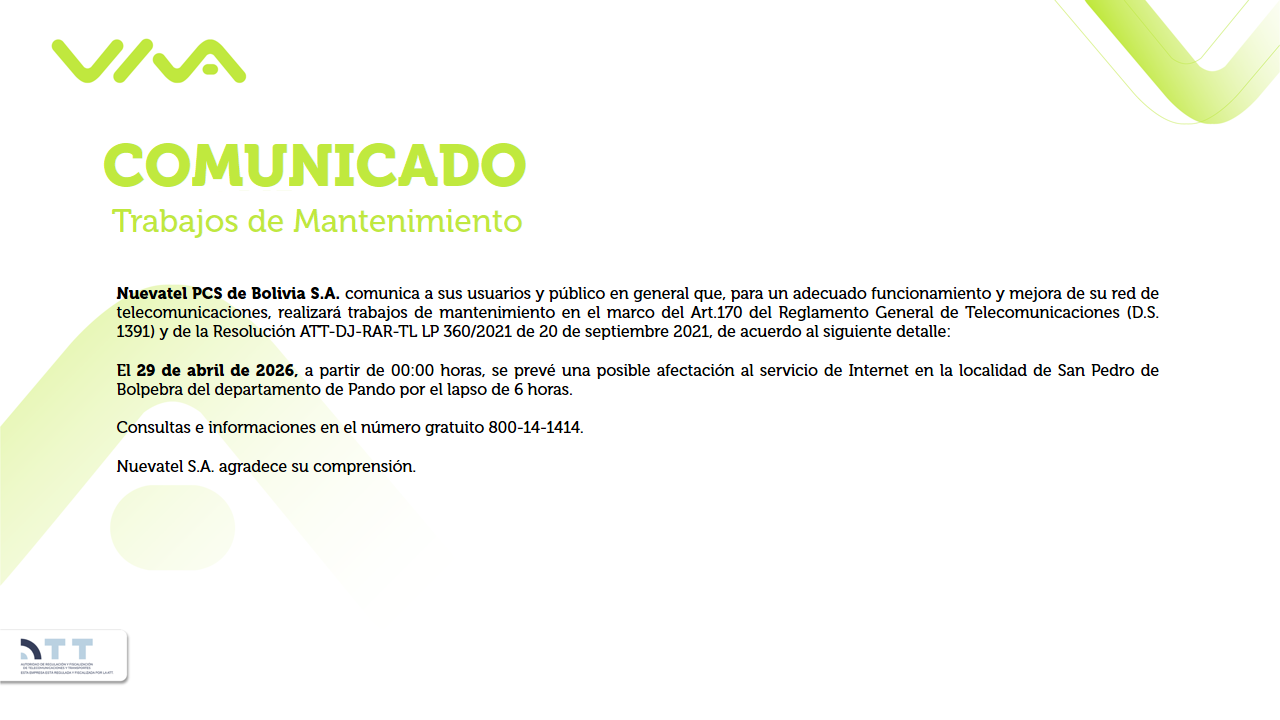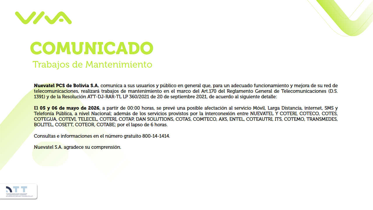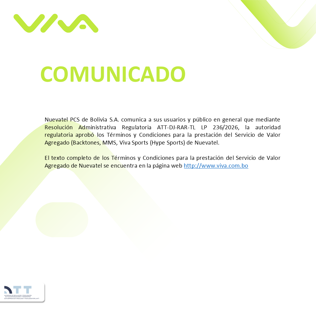 VIVA Comunicados Fecha de publicación: 23-04-2026 Saldos no consumidos de crédito y MB VER COMUNICADO Fecha de publicación: 22-04-2026 Trabajo de Mantenimiento 29 de abril VER COMUNICADO Fecha de publicación: 21-04-2026 Trabajos de Mantenimiento 28 al 30 de abril VER COMUNICADO Fecha de publicación: 21-04-2026 Trabajos de Mantenimiento 05 y 06 de mayo VER COMUNICADO Fecha de publicación: 16-04-2026 T&C del Servicio de Valor Agregado VER COMUNICADO 1 23... 178 Siguiente