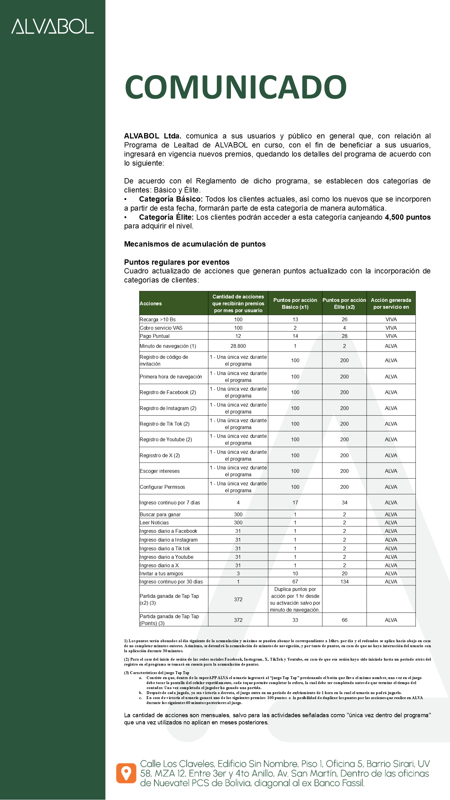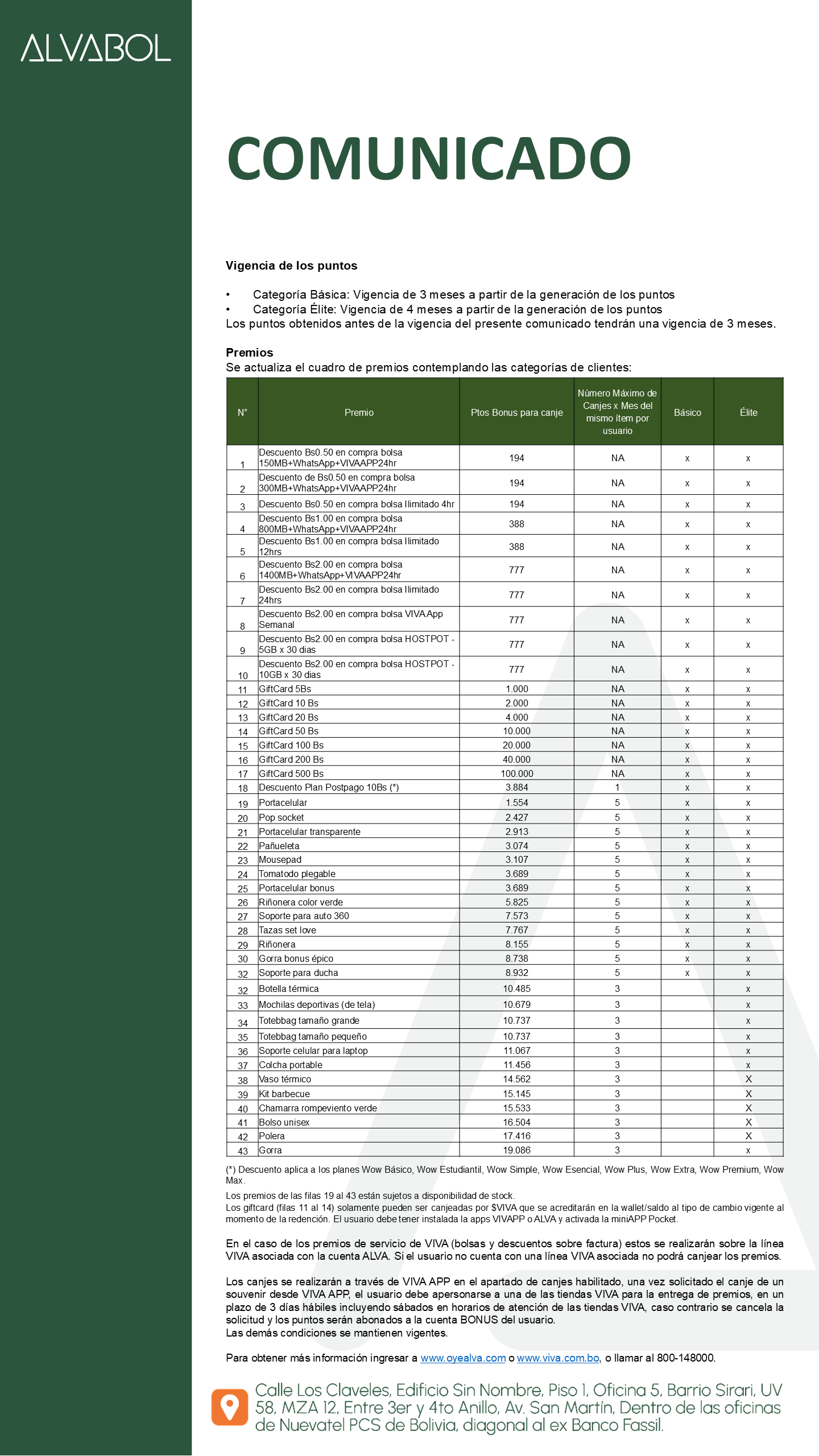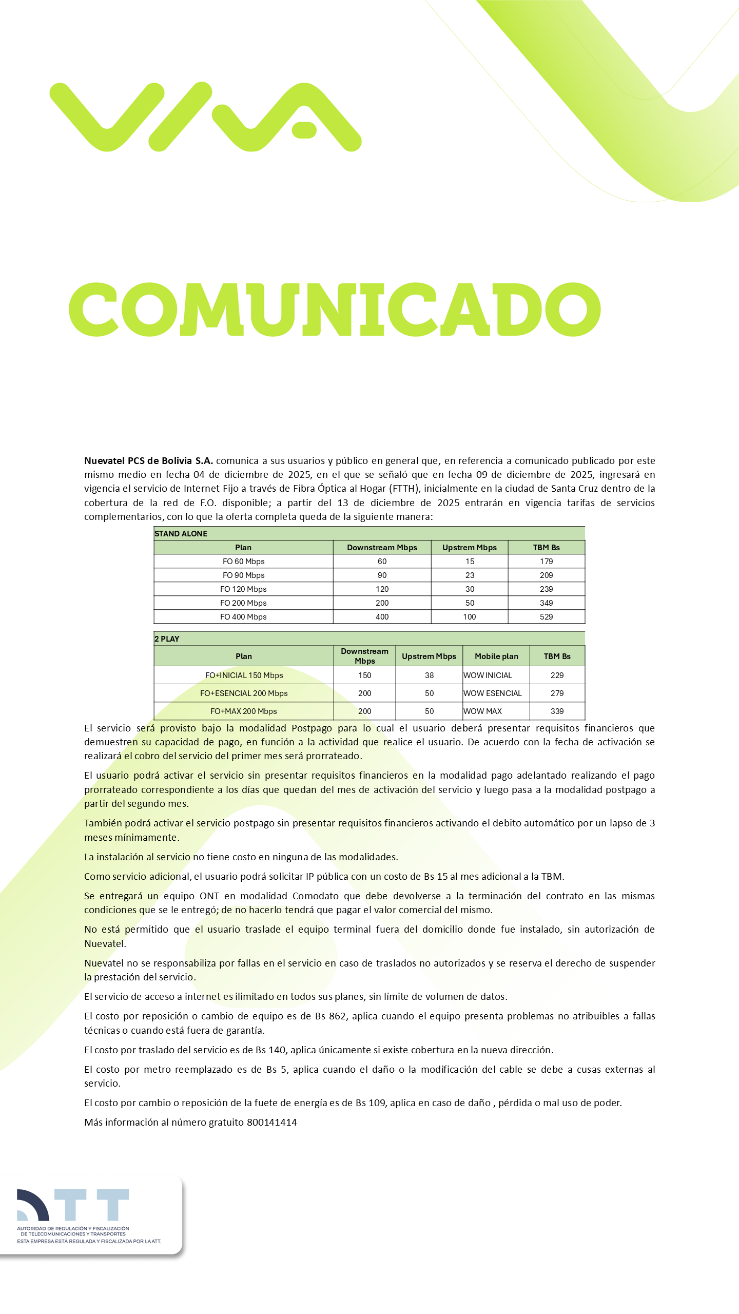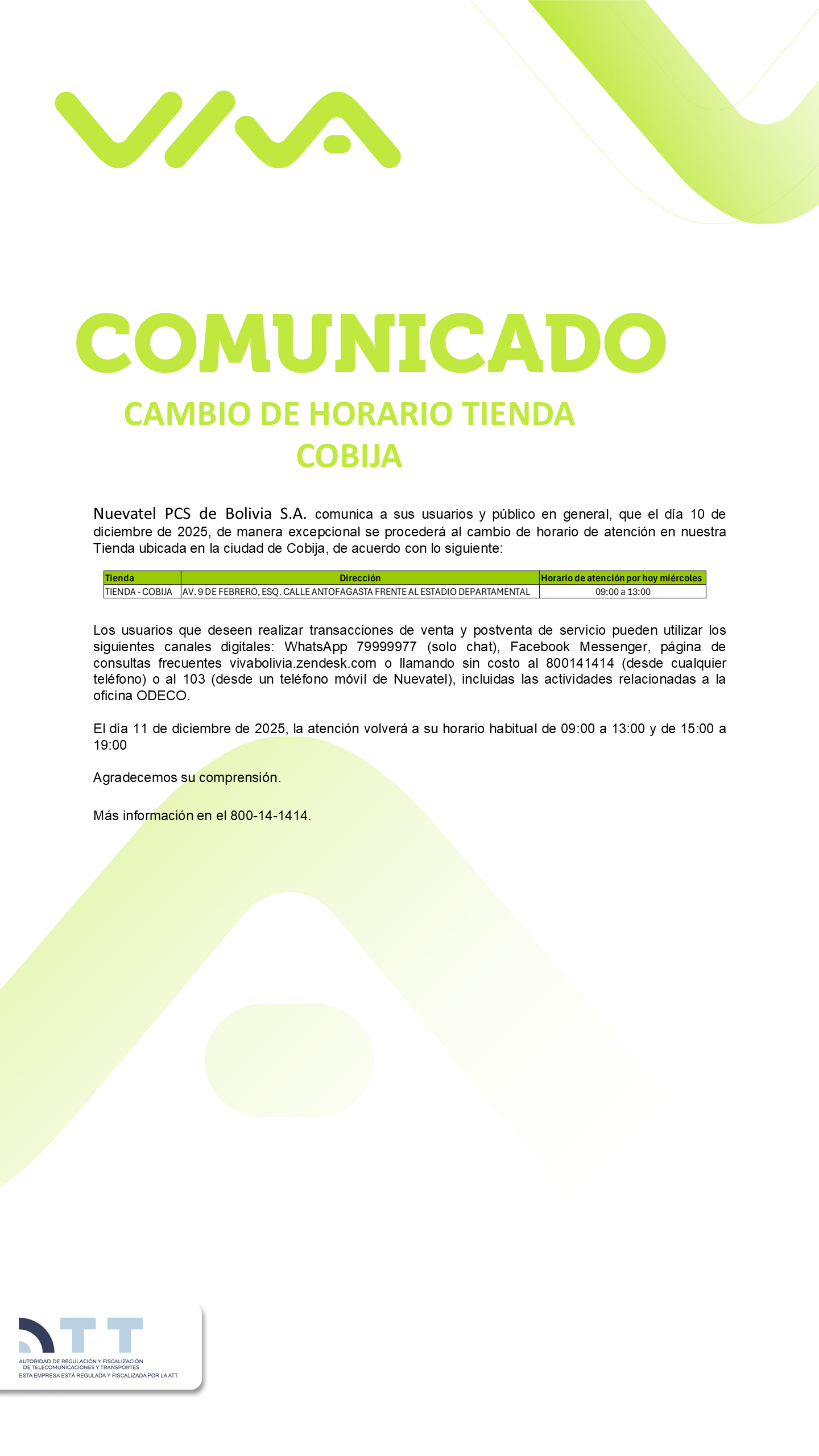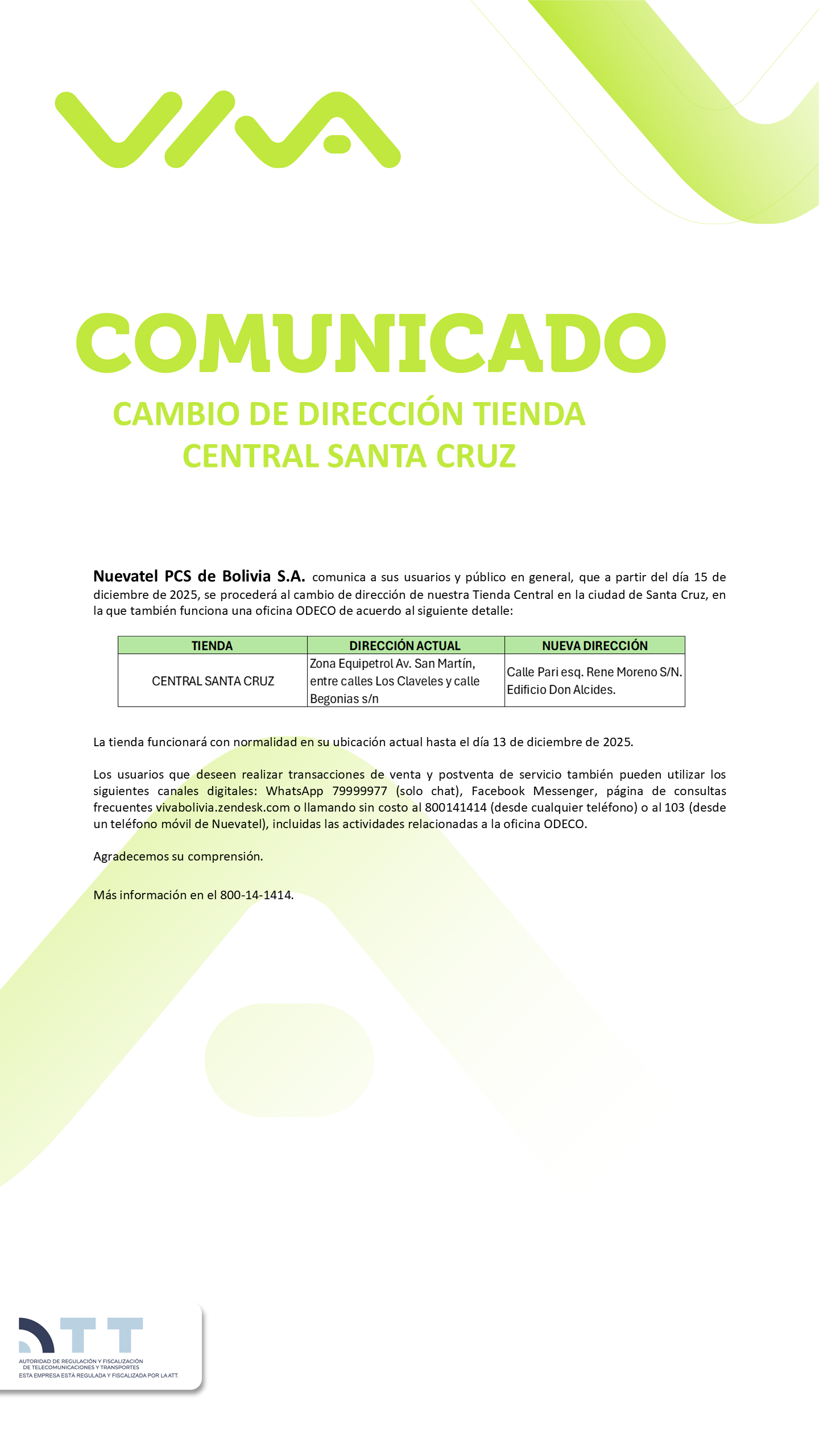 VIVA Comunicados Fecha de publicación: 10-12-2025 Cambio dirección tienda Central Santa Cruz VER COMUNICADO Fecha de publicación: 10-12-2025 Se complementa comunicado FTTH VER COMUNICADO Fecha de publicación: 10-12-2025 Cambio de Horario tienda Cobija VER COMUNICADO Fecha de publicación: 09-12-2025 Comunicado Bolsas Gift Card -1 VER COMUNICADO Fecha de publicación: 09-12-2025 Comunicado Bolsas Gift Card -2 VER COMUNICADO Anterior12 34... 163 Siguiente