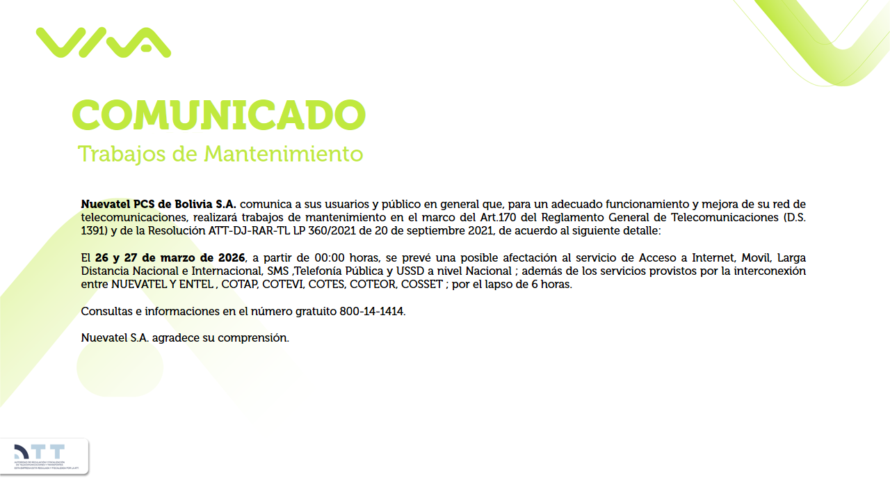 VIVA Comunicados Fecha de publicación: 17-03-2026 Trabajos de mantenimiento 24 de marzo VER COMUNICADO Fecha de publicación: 17-03-2026 Trabajos de mantenimiento 26 y 27 de marzo VER COMUNICADO Fecha de publicación: 17-03-2026 Trabajos de mantenimiento 26 de marzo VER COMUNICADO Fecha de publicación: 13-03-2026 Trabajos de Mantenimiento 20 de marzo VER COMUNICADO Fecha de publicación: 12-03-2026 Trabajos de Mantenimiento 19 y 20 de marzo VER COMUNICADO Anterior12 34... 176 Siguiente