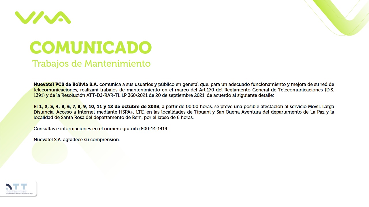 Comunicado baja RBS 2G 5 sitios Santa Cruz y Tarija