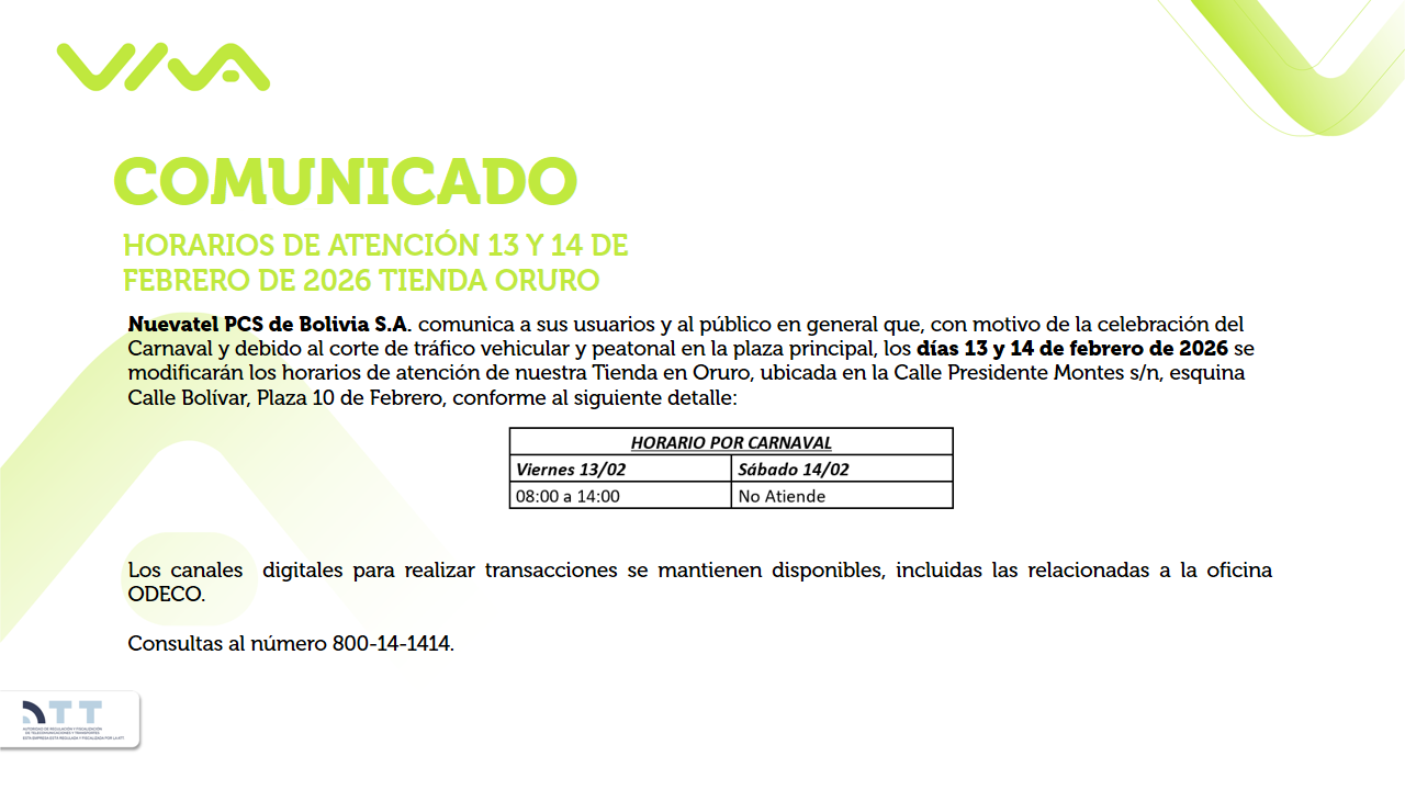 Horarios de atención 13 y 14 de febrero Tienda Oruro